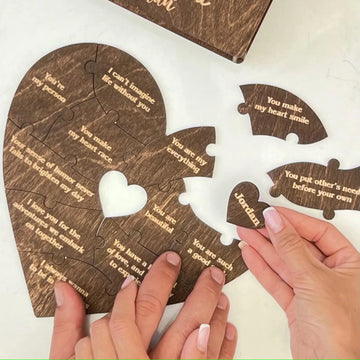The Heart-Shaped Puzzle is a personalized gift featuring 12, 18, or 28 engraved reasons why you love someone, with their name displayed at the center. It's a thoughtful way to express your love.